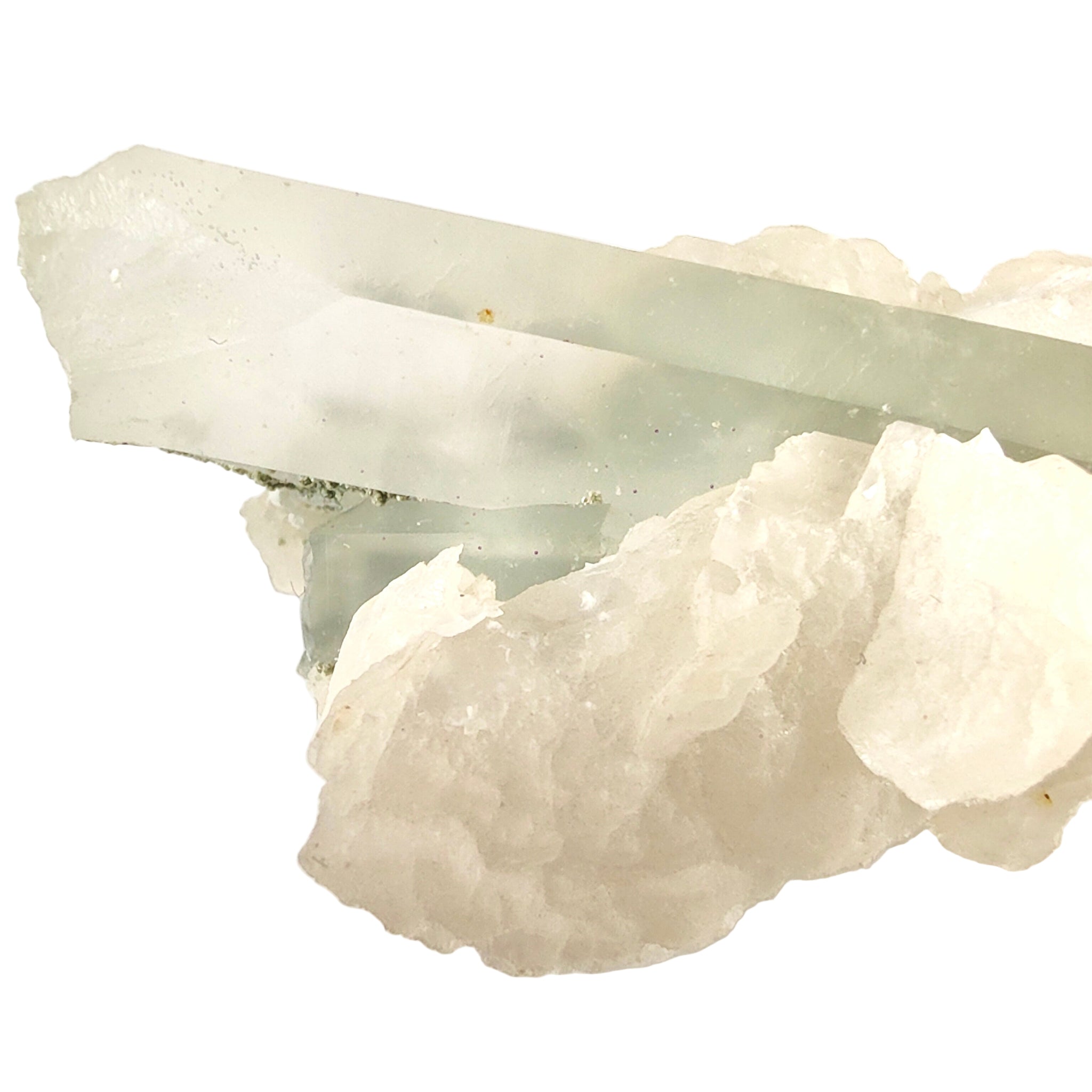 Chlorite Quartz + Calcite is a naturally formed combination believed to support gentle cleansing, balance and renewal. Chlorite within Quartz is said to encourage energetic clearing and grounding, while Calcite is often associated with emotional balance and mental clarity. Together, they are thought to promote calm reflection, steady energy and a sense of restoration, making this pairing popular for meditation and mindful spaces.