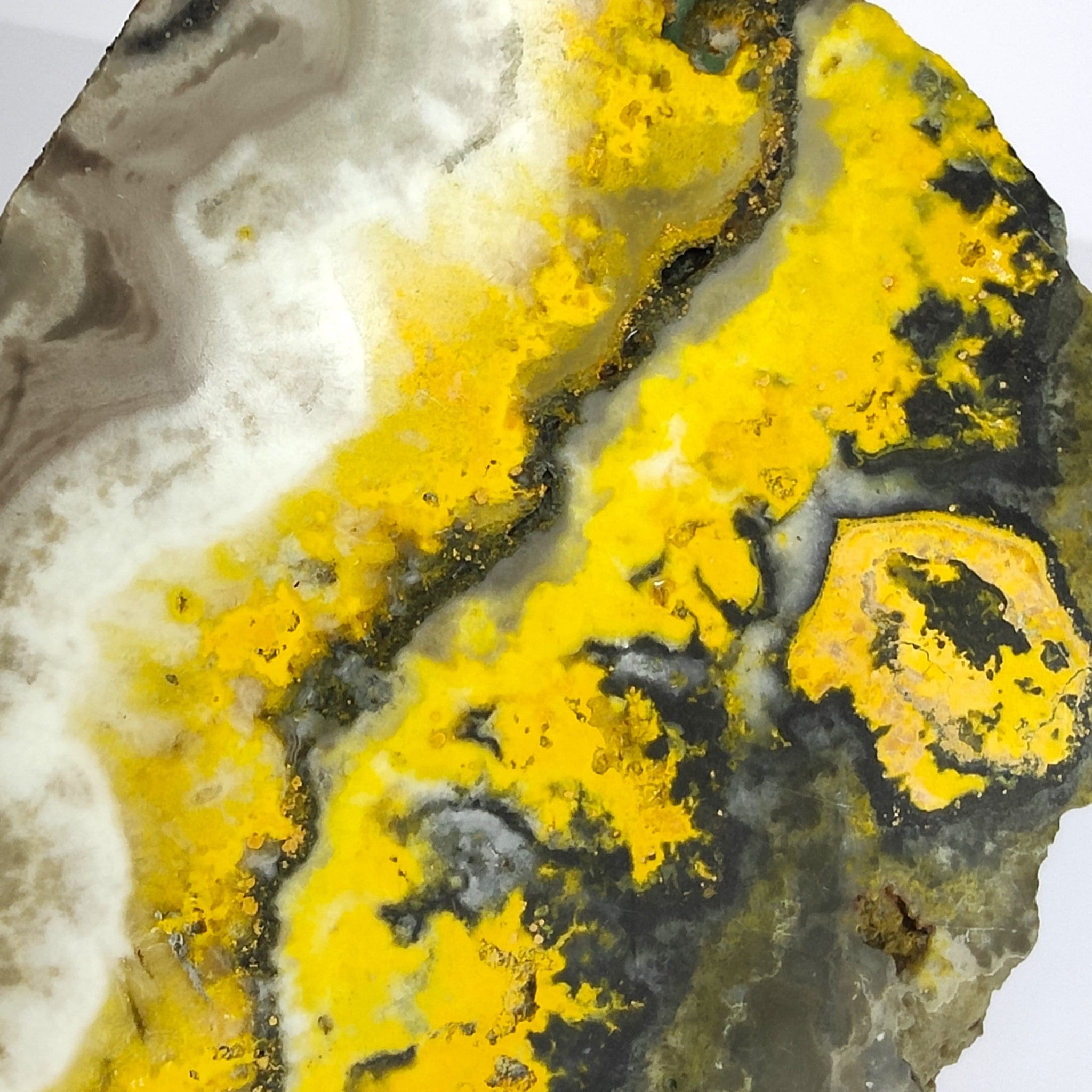 Bumblebee Jasper is a striking gemstone formed from volcanic activity, with vibrant patterns of yellow, orange, and black. It is primarily composed of minerals such as sulfur and other volcanic materials, which contribute to its unique appearance. It is also thought to have metaphysical properties, including enhancing creativity and boosting energy.