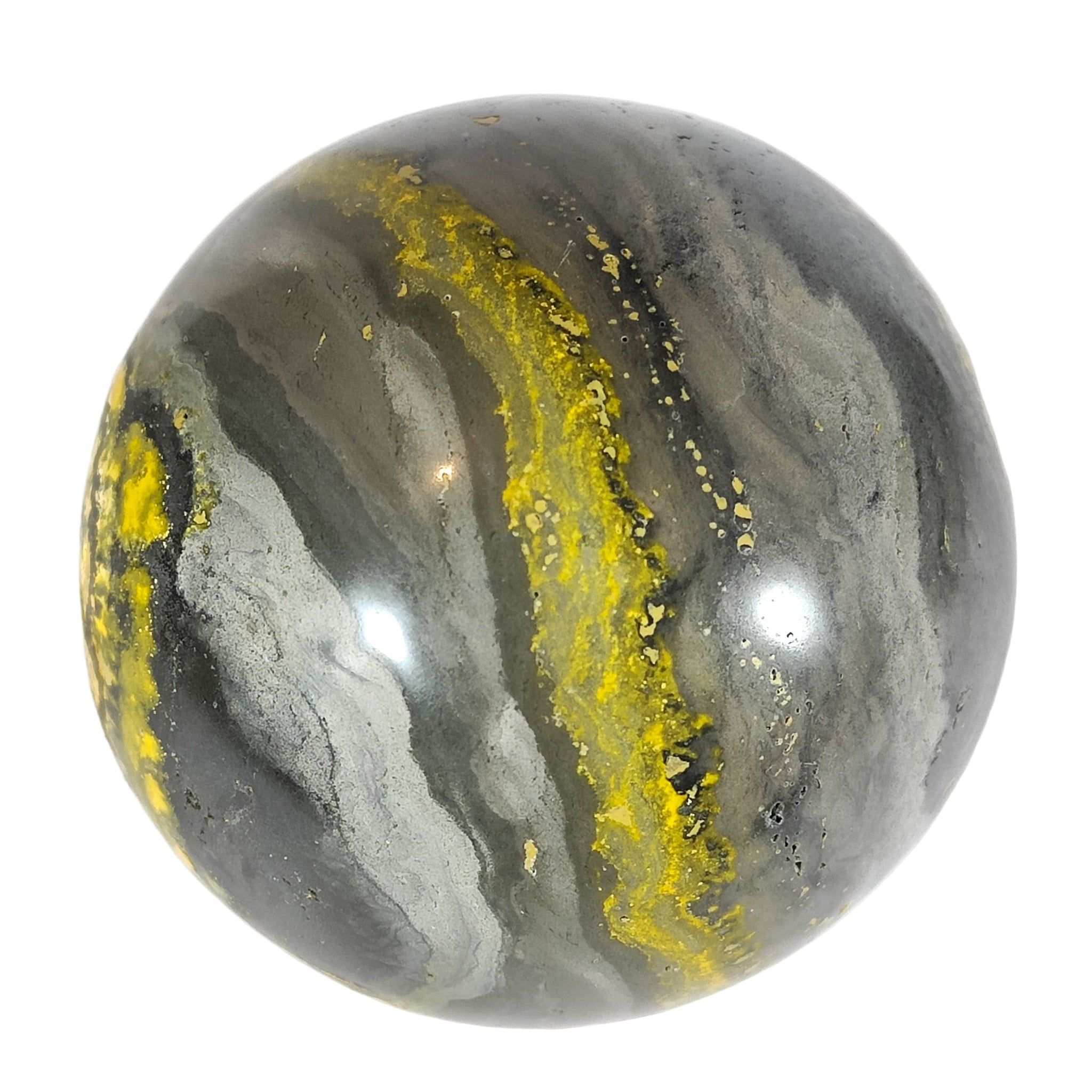 Bumblebee Jasper is a striking gemstone formed from volcanic activity, with vibrant patterns of yellow, orange, and black. It is primarily composed of minerals such as sulfur and other volcanic materials, which contribute to its unique appearance. It is also thought to have metaphysical properties, including enhancing creativity and boosting energy.